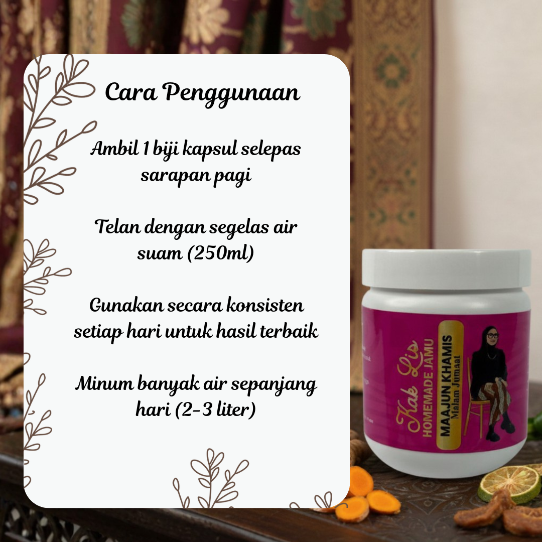 Formula tradisional Kak Lis menggunakan ramuan terpilih seperti Daun Epimedium, Halia, Lengkuas, Madu, Daun Dukung Anak dan Kemuning – untuk kesihatan intim yang optimum.