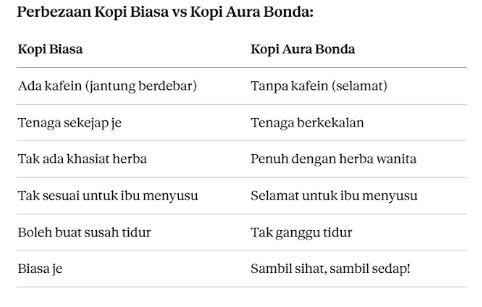 Kopi Aura Bonda adalah minuman herba wanita yang unik – kopi tanpa kafein yang penuh dengan khasiat herba tradisional! Untuk yang tak tahan pahit jamu tapi nak badan cergas dan bertenaga sepanjang hari. Rasa macam kopi biasa yang sedap, tapi sebenarnya dipenuhi dengan kebaikan Kacip Fatimah, Manjakani, dan Akar Serapat – formula Kak Lis untuk bantu wanita kekal fresh, berseri dan tak cepat letih.